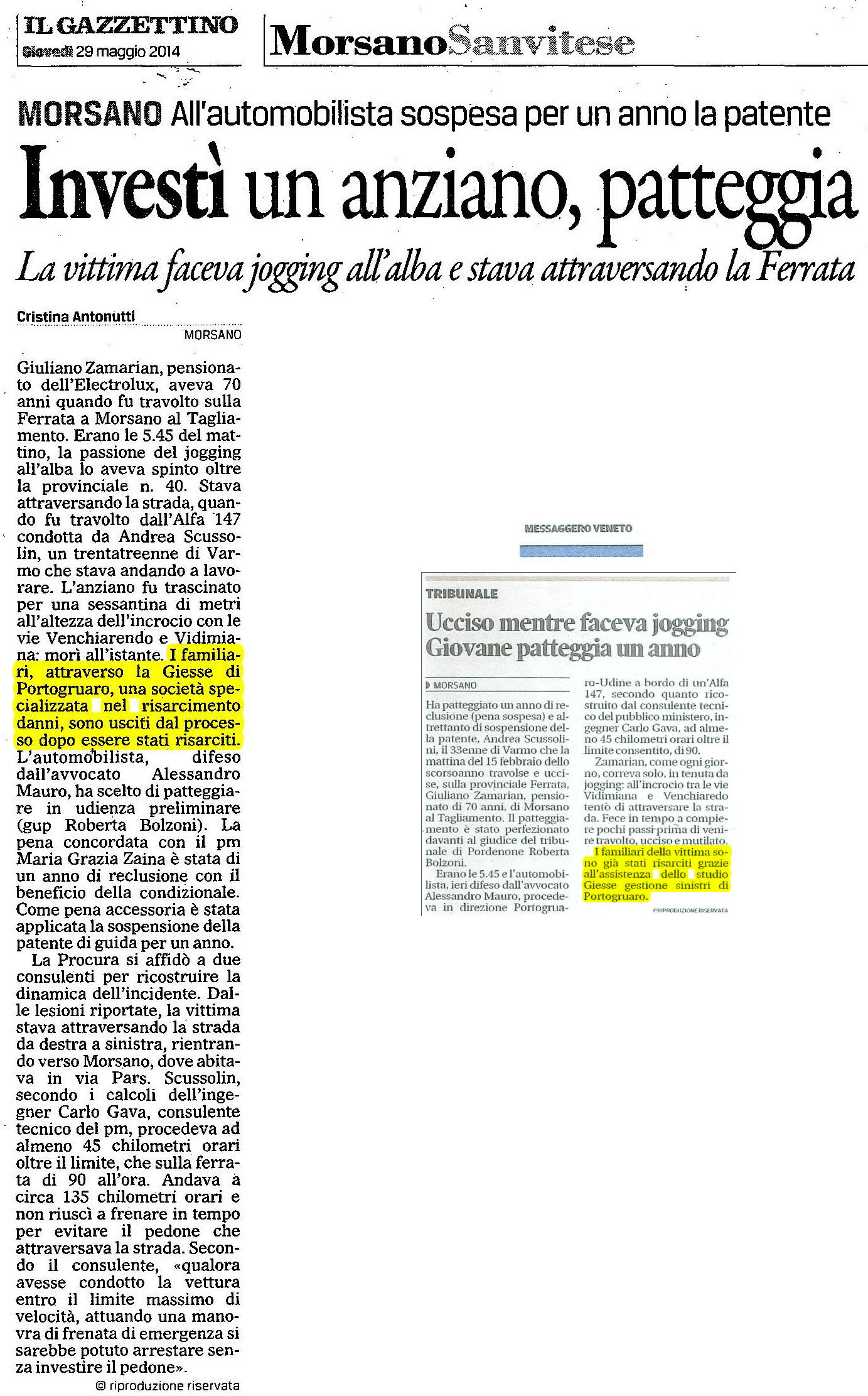 I familiari, attraverso la Giesse Gestione Sinistri di Portogruaro, una società specializzata nel risarcimento danni, sono usciti dal processo dopo essere stati risarciti (pedone investito risarcimento danni). L’automobilista ha scelto di patteggiare in udienza preliminare. La pena concordata con il pm è stata di un anno di reclusione con il beneficio della condizionale.